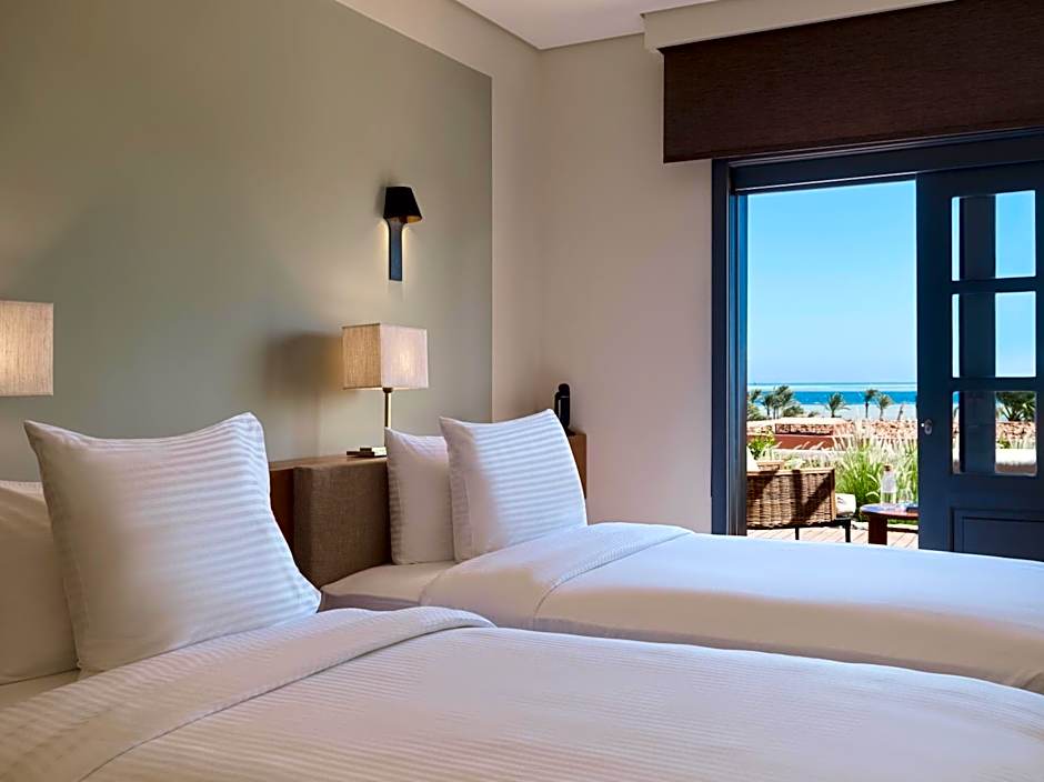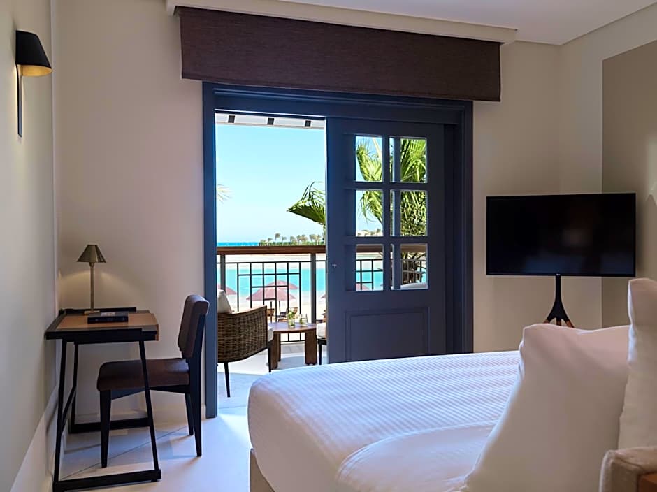 Measuring 64 square yards. Junior Sea View Suite consist of a living room with seating area and a separate bedroom with King with a built-in wardrobe and a small desk. Junior Sea View Suite is located at the top floor of the Hill tower and enjoy a panoramic view over the red sea and El Gouna. Amenities include flat-screen TV with satellite channels WIFI, Digital room keys, mini-bar, and luxurious marble bathroom.